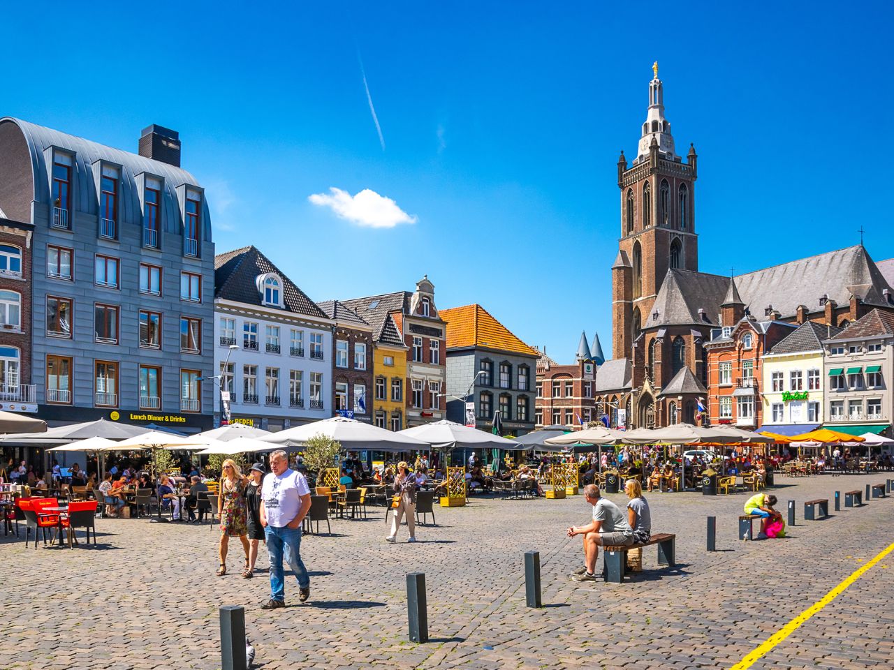 Marktplatz in Roermond mit Straßencafés, Spaziergängern und Blick auf die Kathedrale während der Interaktive Monumententour.
